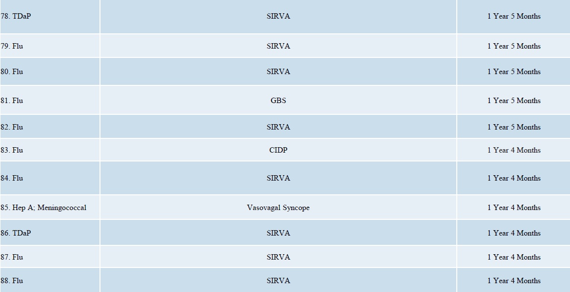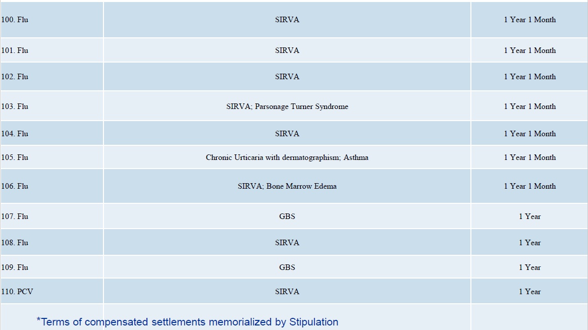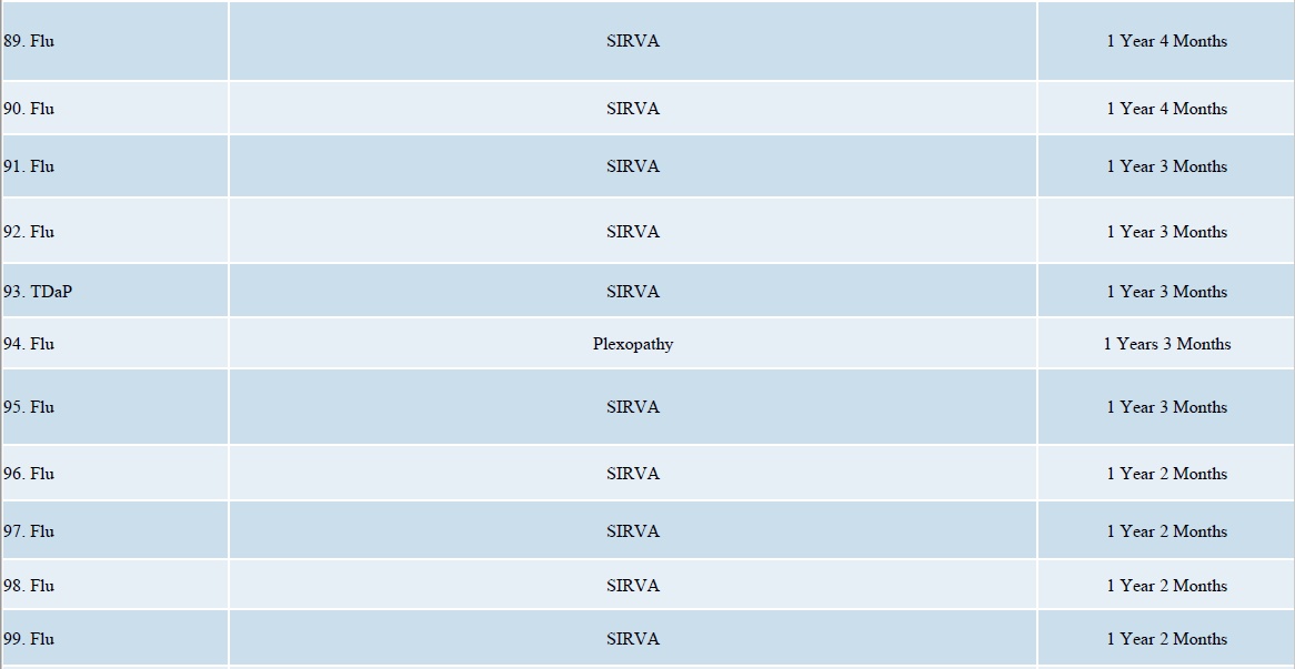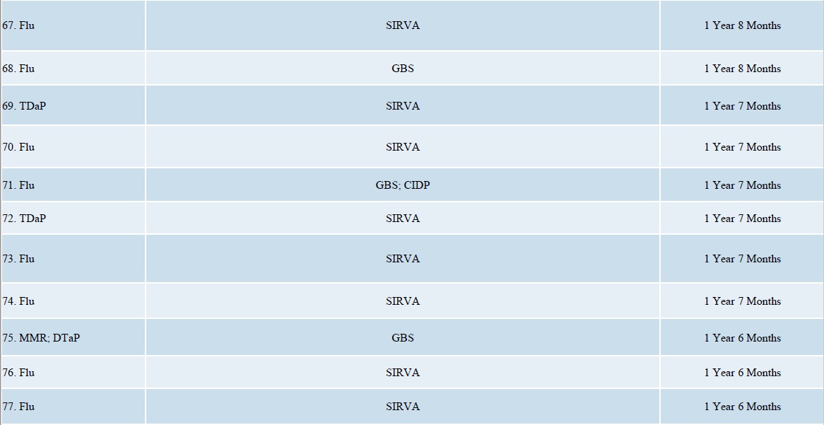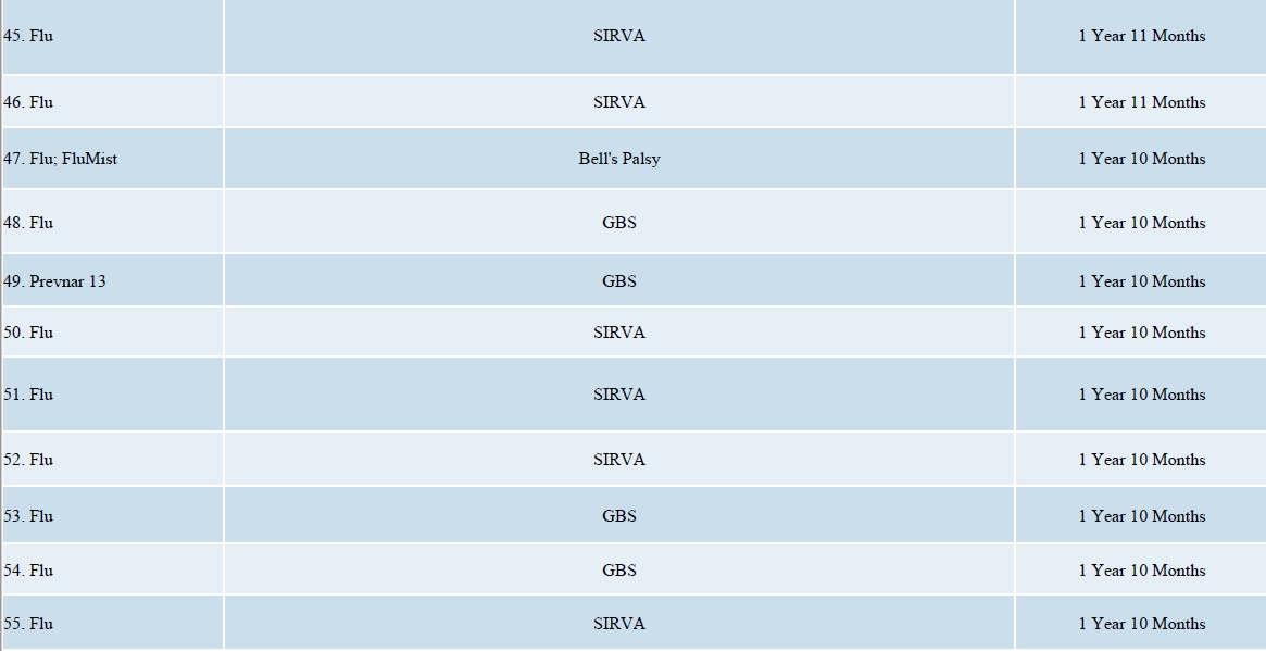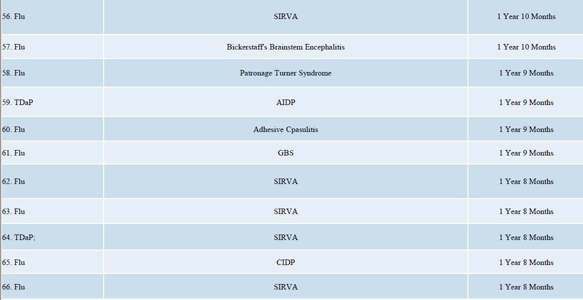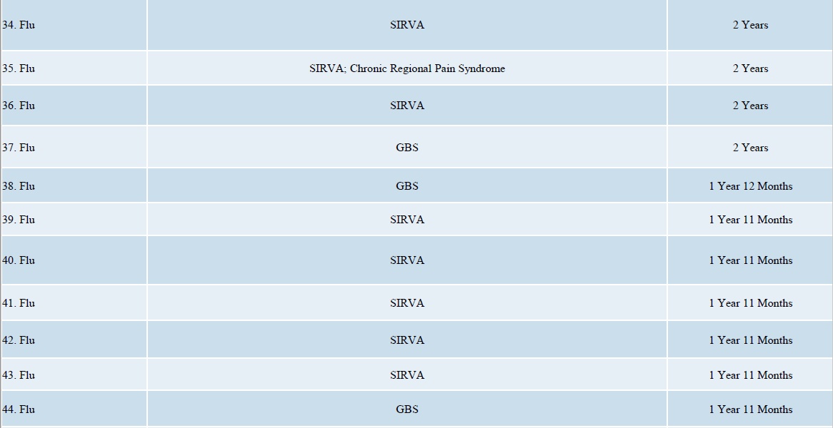 The December, 2019 DOJ report lists 110 of these settlements for vaccine injuries and deaths, and 85 of those were for damages caused by the flu vaccine (see below).