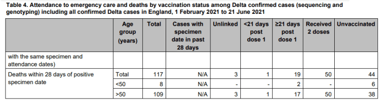 It is claimed that the vaccines reduce the chances of suffering serious illness if infected with Covid-19 significantly, so although a significantly higher amount of vaccinated over 50’s have a confirmed case of the Delta variant compared to those who are unvaccinated, you would assume that the opposite would be seen in the number of people who have allegedly died to the Delta variant?