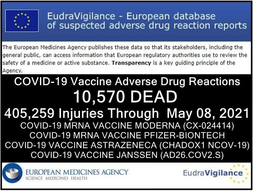 Their report through May 8, 2021 lists 10,570 deaths and 405,259 injuries following injections of four experimental COVID-19 shots: