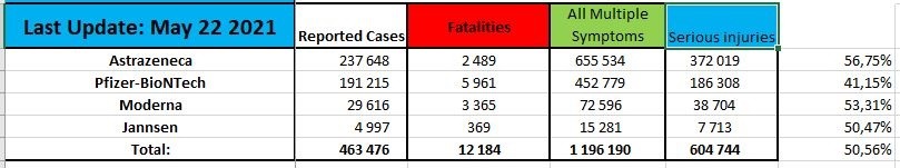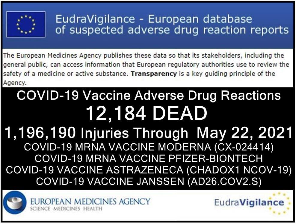 Their report through May 22, 2021 lists 12,184 deaths and 1,196,190 injuries following injections of four experimental COVID-19 shots: