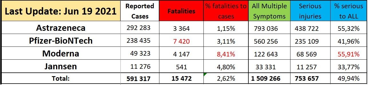 The EudraVigilance database reports that through June 19, 2021 there are 15,472 deaths and 1,509,266 injuries reported following injections of four experimental COVID-19 shots:
