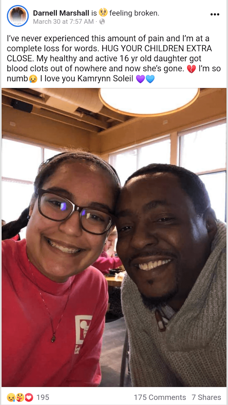 Kamrynn’s father, Darnell Marshall, also announced his daughter’s death.