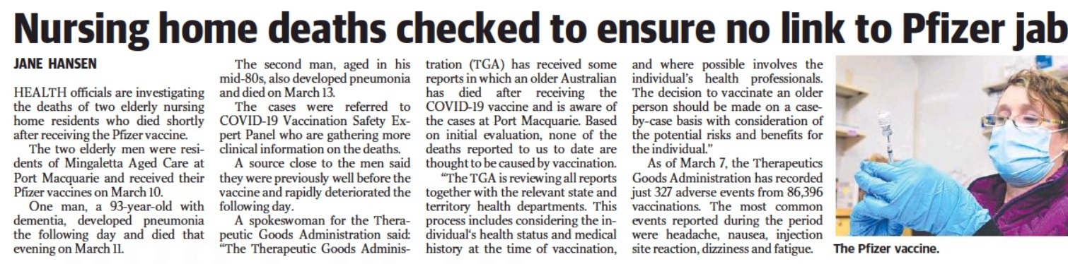 Someone from the Informed Medical Options Party (IMOP) in Australia livestreamed a video on Facebook to talk about the deaths, and how the Sunday Telegraph buried the story on page 21. He states that if they had died from COVID, it would have been headline news and prompted more lockdowns.