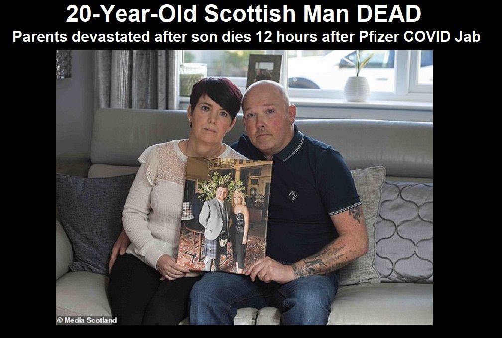 The Daily Mail is reporting today that a 20-year-old young Scottish man has died within 12 hours of receiving the experimental Pfizer COVID mRNA injection, leaving his parents devastated.