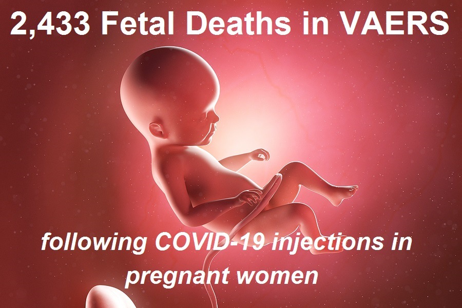 There have now been 2,433 fetal deaths recorded in VAERS (Vaccine Adverse Event Reporting System) from pregnant women who have been injected with one of the COVID-19 shots. (Source.)