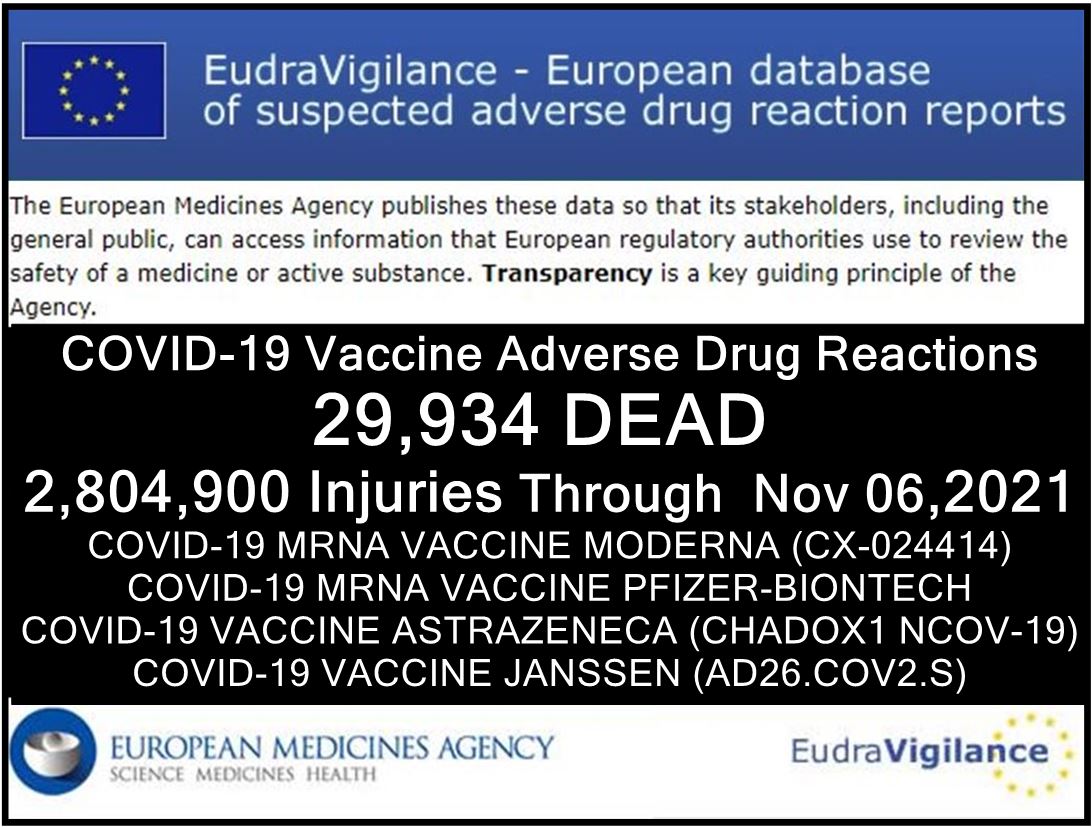The EudraVigilance database reports that through October 19, 2021 there are 29,934 deaths and 2,804,900 injuries reported following injections of four experimental COVID-19 shots: