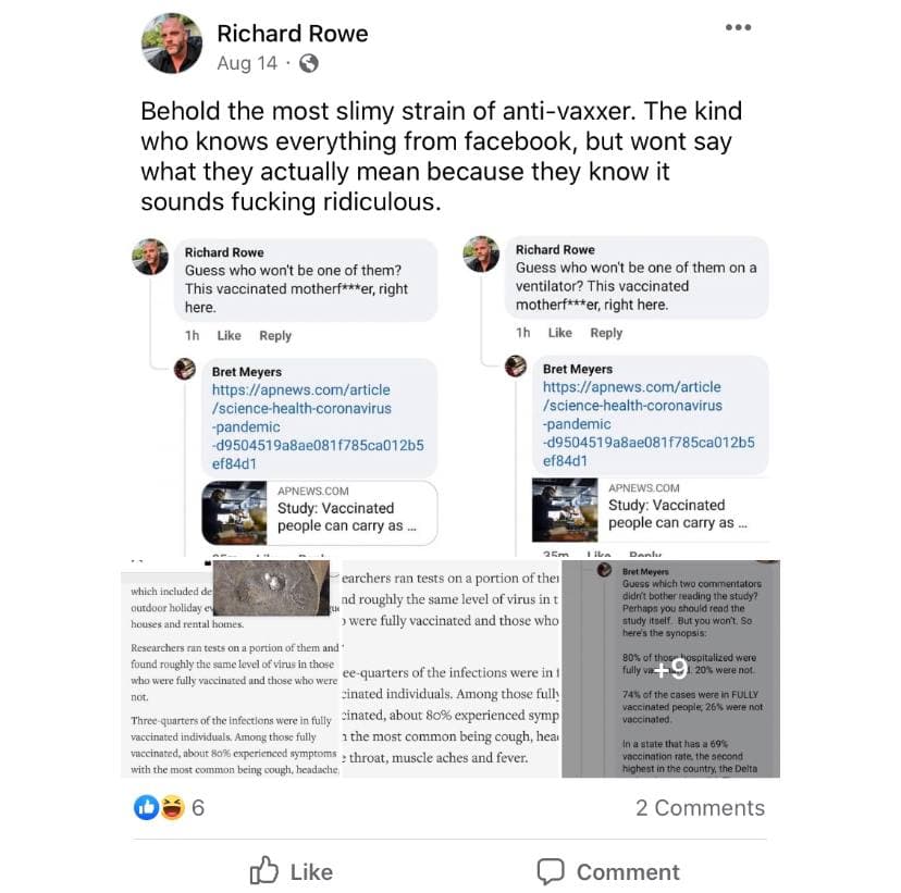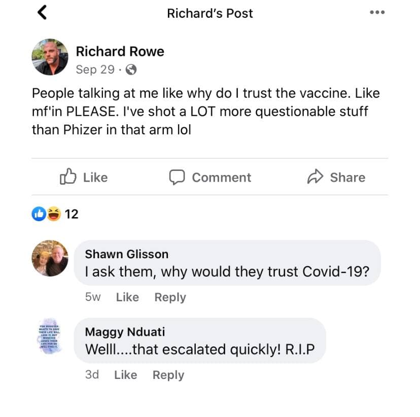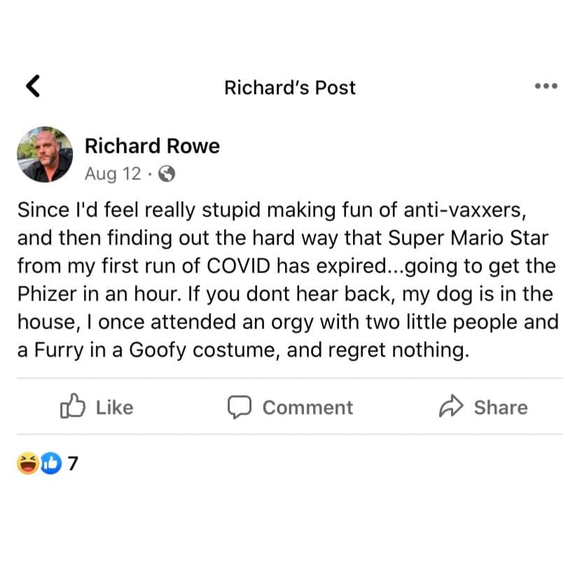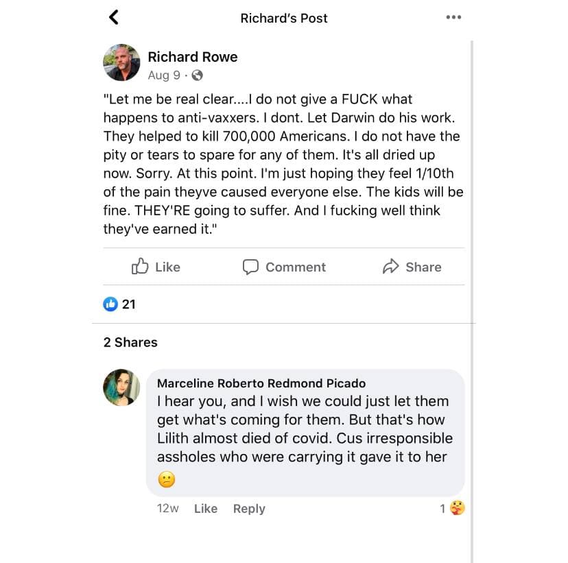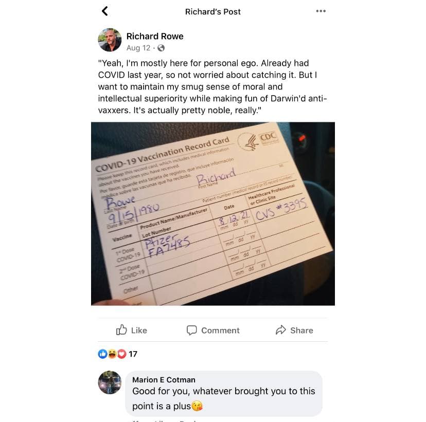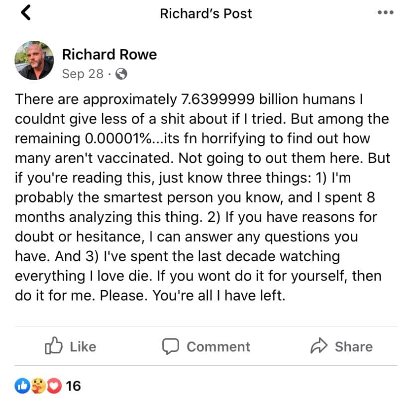 Richard Rowe was an outspoken critic of “anti-vaxxers,” mistakenly believing that they were stupid and uninformed. When he addressed them, he stated “I am probably the smartest person you know, and I spent 8 months analyzing this thing.”