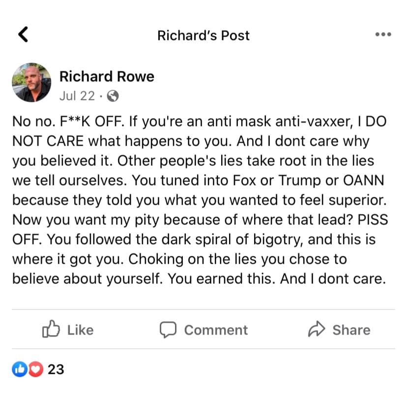 If you’re an anti mask anti-vaxxer, I DO NOT CARE what happens to you. And I don’t care why you believed it. Other people’s lies take root in the lies we tell ourselves.