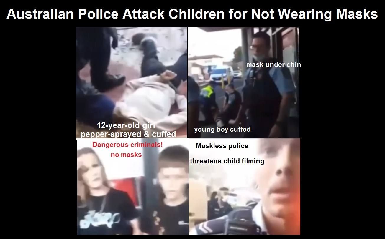 Well it would seem that things have descended even further, going from bad to horrible, as video footage is now circulating of police actually attacking young children for simply not wearing masks, throwing them on the ground to cuff them, and even pepper-spraying a 12-year-old girl.
