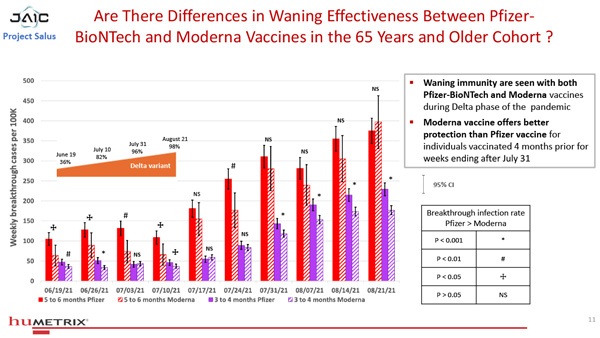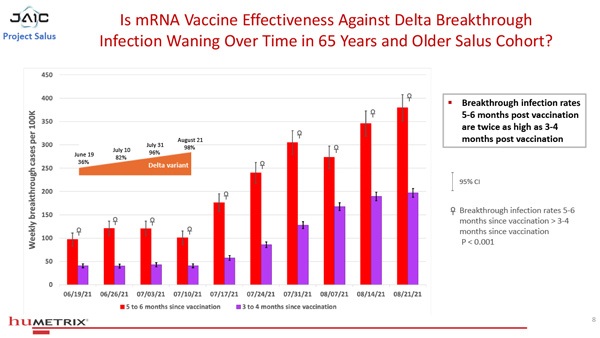 One slide from the analysis reveals that so-called “breakthrough” infections — vaccine failures — increase with time, showing a near doubling of breakthrough infections among those vaccinated 5-6 months ago vs. those vaccinated only 3-4 months ago.