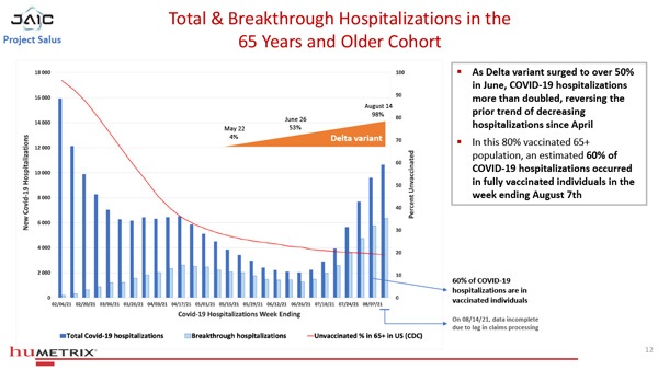 In this 80% vaccinated 65+ population, an estimated 60% of COVID-19 hospitalizations occurred in fully vaccinated individuals in the week ending August 7th.