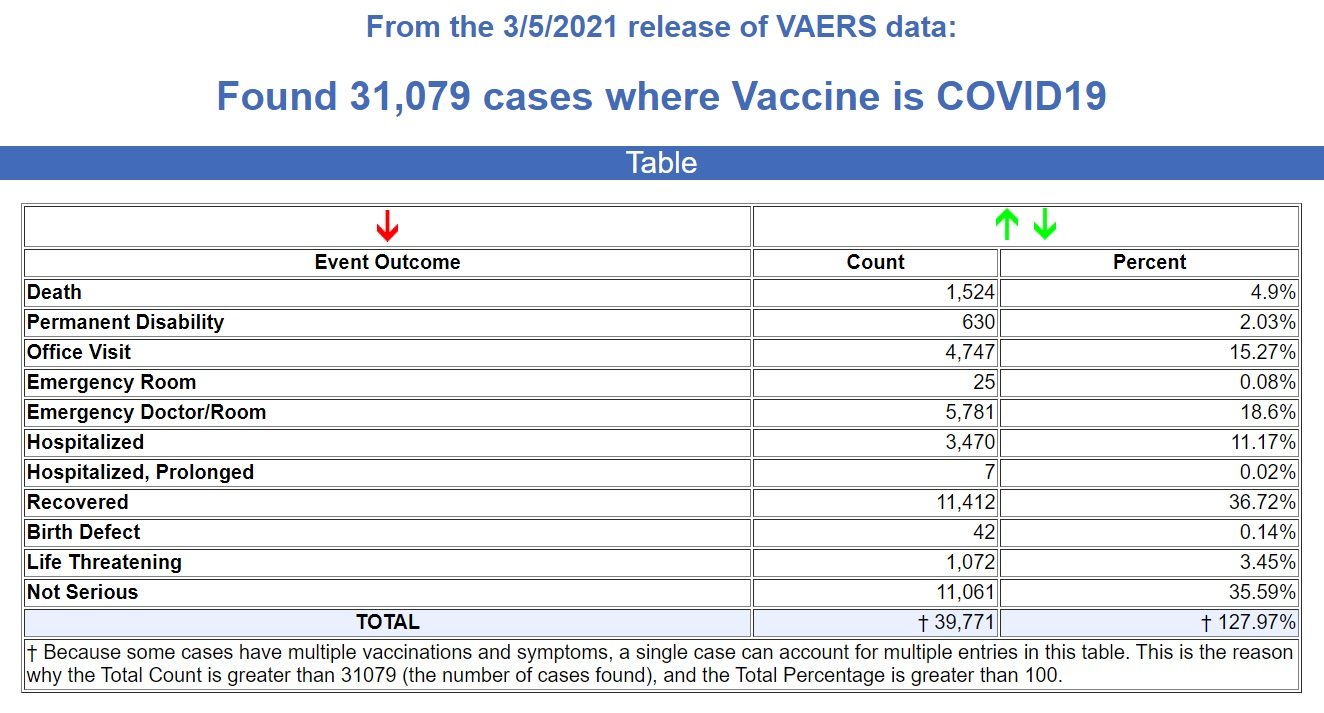 The data goes through March 5, 2021, with 31,079 recorded adverse events, including 1,524 deaths following injections of the experimental COVID mRNA shots by Pfizer and Moderna.