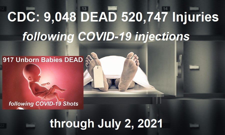 December 2020 to July 2, 2021: 9,048 deaths from COVID-19 shots only. (Source.)