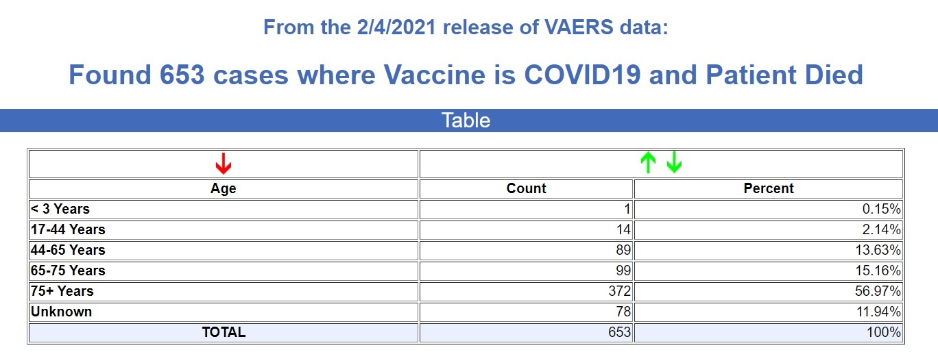 A search of the VAERS database, which has data through 2/4/2021, lists only 653 reported deaths.