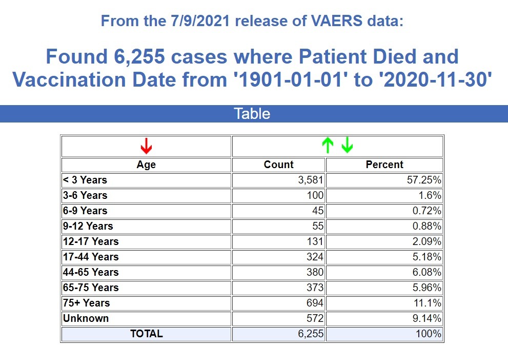 The Medalerts.org interface for the VAERS government database allows one to search all the way back to 1901, and from January 1, 1901 through November 30, 2020, which is the last month before the COVID-19 shots were given emergency use authorization, there are a total of 6,255 deaths recorded following ALL vaccines.
