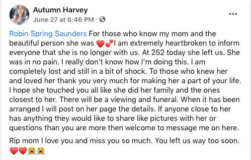 The damage was too severe to overcome. Ms. Autumn Harvey, Robin’s daughter, confirmed that her mother passed away later that afternoon. Several others confirmed her death thereafter.