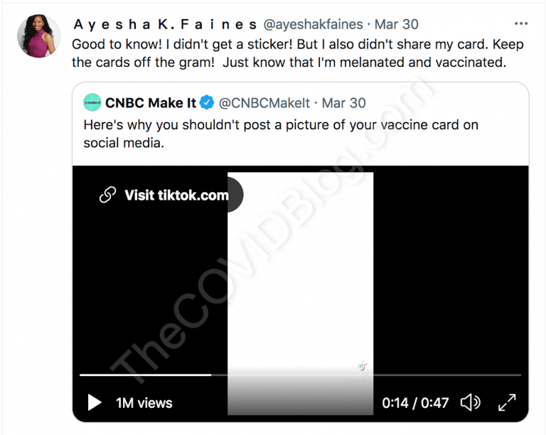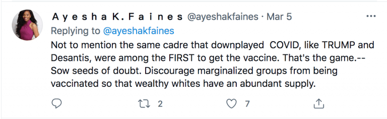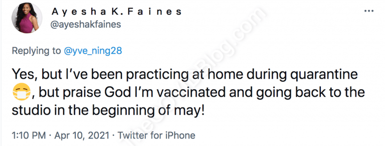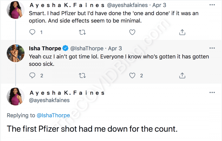 Ms. Ayesha K. Faines received the second dose of experimental Pfizer mRNA sometime around March 15, according to her Twitter posts. It is unclear exactly when she received the first and second shots. But her earliest post about being vaccinated is from March 30.