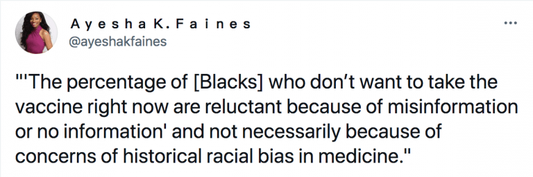 Ms. Faines, like the late MSNBC legal analyst Midwin Charles and Dr. Kizzmekia Corbett, was used as a disinformation agent for big pharma. She regurgitated mainstream media talking points and subterfuges hoping to coax Black Americans into submission.