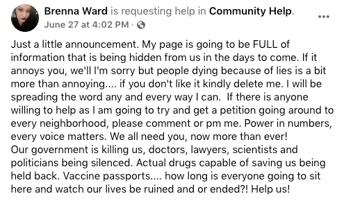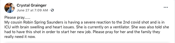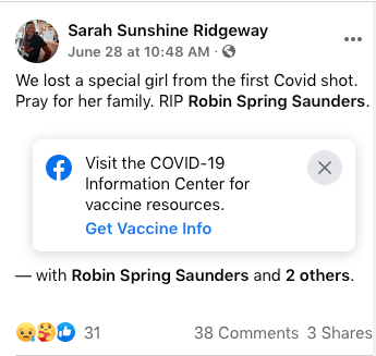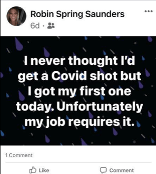 Ms. Robin Spring Saunders received her first injection of experimental mRNA on June 21, according to her Facebook page. It’s unclear if it was Pfizer or Moderna.