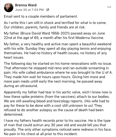 Bruce David Ward: 64-year-old Canadian man suffers sudden aortic dissection, dead 30 days after first experimental Moderna mRNA injection