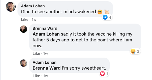 Brenna isn’t allowing her father to die in vain. She drew a line in the sand on June 27 telling her friends and acquaintances to discontinue communication if they support the COVID agenda. Brenna also admitted that it took her father’s death for her to open her eyes to what is happening.