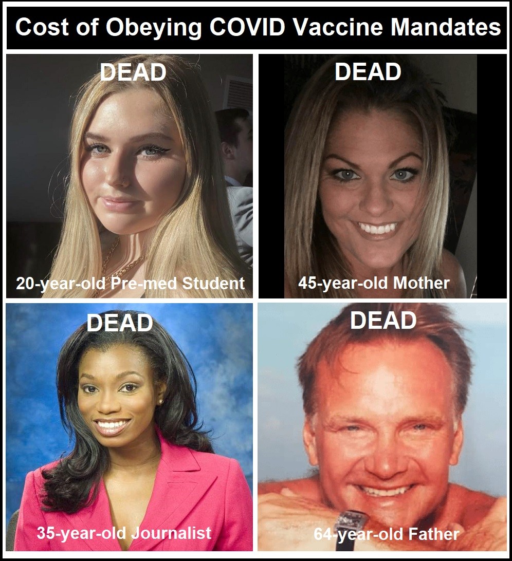 We bring you four more stories of those who gave in to social pressure to get the shots, but did not live long enough to regret their decisions. Those regrets will have to live on with their families and loved ones who will never see them again in this life.