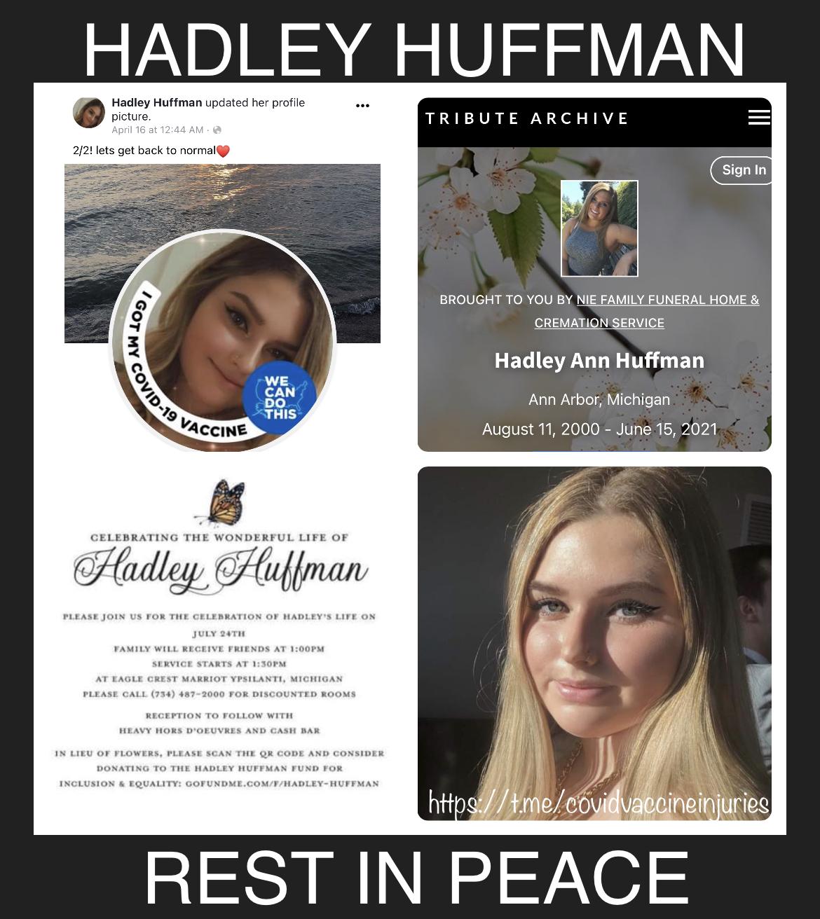 Hadley Huffman of Michigan passed away unexpectedly on June 15, 2021 not long after her second covid shot. Family and friends shared their grievances on social media and we are thankful they did. There are many stories like Hadley’s going untold at the moment, and it is problematic.