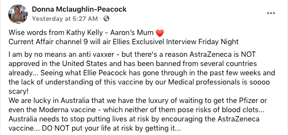 Ellie’s mother, Donna Mclaughlin-Peacock, is also a healthcare worker. She seems to understand the inherent dangers of the AstraZeneca shots, but appears to be ok with the equally-dangerous Pfizer and Moderna shots.