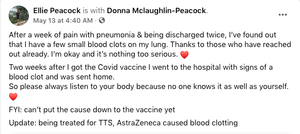 Despite the life-altering ordeal, Ms. Peacock said it was “nothing too serious” and that she “can’t put the cause down to the vaccine yet.” But she updated her May 13 Facebook status and wrote, “AstraZeneca caused the blood clotting.”