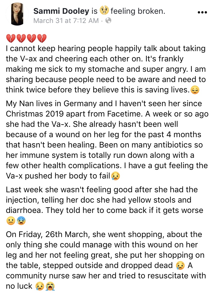 Helga’s granddaughter Sammi Dooley wrote a heartfelt post on Facebook as well. Although she doesn’t blame the vaccine entirely, she expresses “a very strong feeling it had something to do with it.”