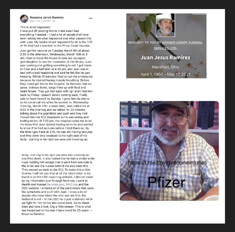 Juan Jesus Ramirez of Mansfield, Ohio passed away on May 17, 2021. It has been said that he was experiencing complications with his Pfizer covid vaccine and did not recover. Juan’s obituary also states that his death was caused by “complications of the covid vaccine.”