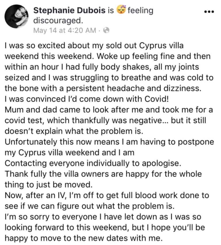 Stephanie wrote, “Maybe I’m having a prolonged reaction to my Covid jab last week, or maybe those side effects affected my immune system and I’ve caught something else in the process.”