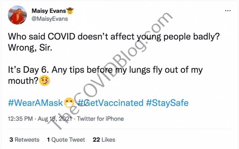 She tweeted “who said COVID doesn’t effect young people badly? Wrong, sir,” on August 19. That tweet included the hashtags #WearAMask and #GetVaccinated.