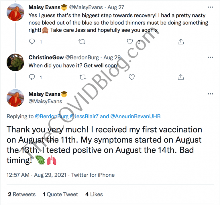 Ms. Maisy Evans received her first experimental mRNA injection on August 11, according to her Twitter page. It is unclear which injection she received. But only Pfizer, Moderna and AstraZeneca are used in Wales. AstraZeneca is only being offered to people over age 40, according to Wales Online. Thus Ms. Evans received the Pfizer injection, which is the only one authorized in the U.K. for children under age 18.