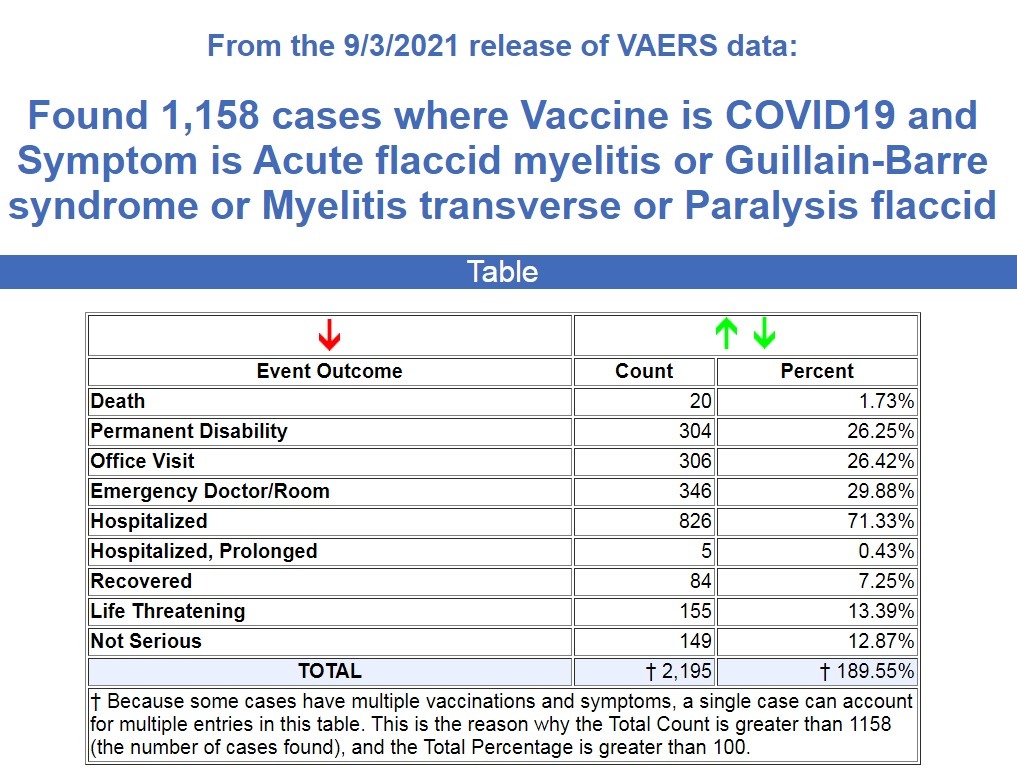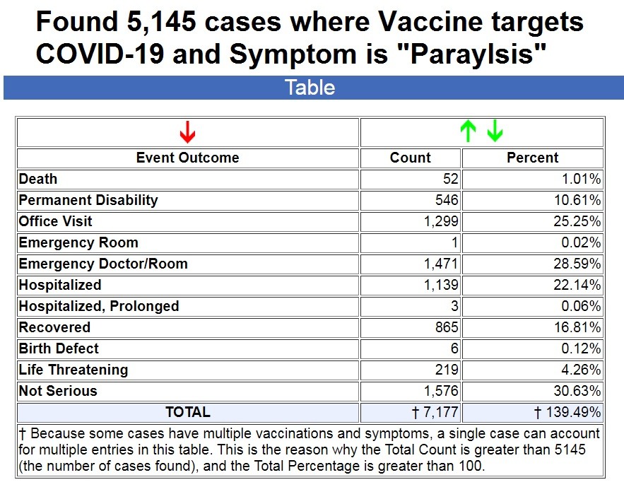 This search, which does not include GBS, Transverse Myelitis, or Acute Flaccid Myelitis, returns another 5,145 cases, with another 52 deaths, 546 permanent disabilities, 1,472 ER visits, 1,142 hospitalizations, and 219 life threatening events. (Note: I did not include all different kind of paralysis in the graphic, but you can see them here.)