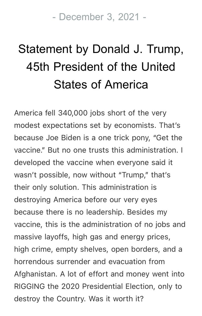 Here is the former President’s full statement, where he takes all the credit, and even refers to the Pfizer “vaccine” (and I assume the Moderna one as well?) as “my vaccine.”