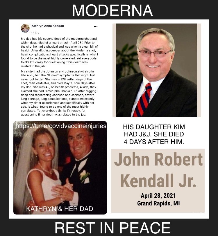 John Robert Kendall Jr. had his second Moderna vaccine in April, and within days he had a heart attack and passed away. He died on April 28, 2021.