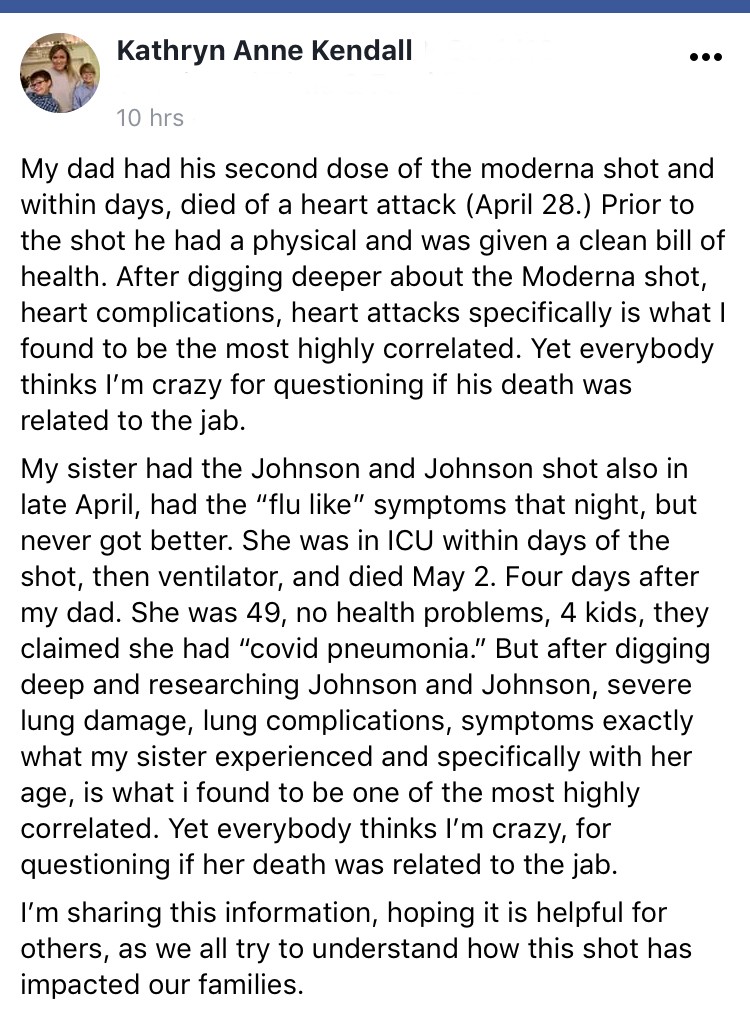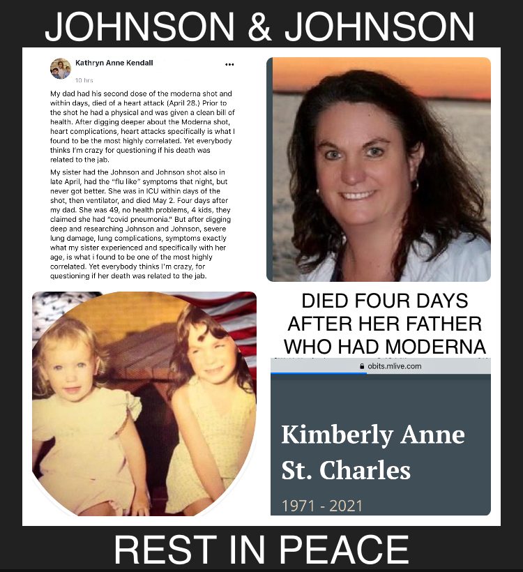 This tragic story out of Michigan was disclosed by Kathryn Kendall. She lost both her father and her sister within four days of one another, and they were vaccinated with different brands of covid vaccines.
