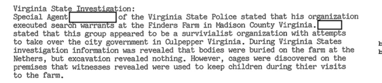 Report mentions bodies being buried on a Finders’ farm in Culpepper, Virginia. There were also cages. The role of the CIA is referenced, but it’s convoluted. It’s almost as if the more powerful agencies treat satanists as a special protected class. In today’s inverted, captured world, that wouldn’t be surprising.