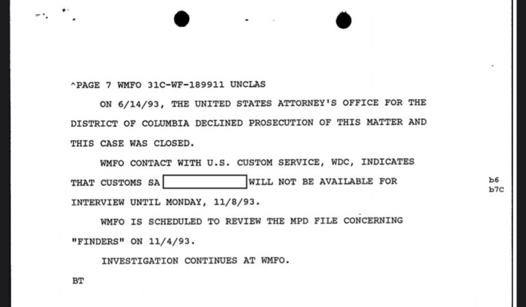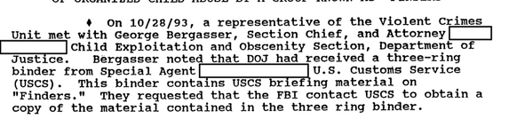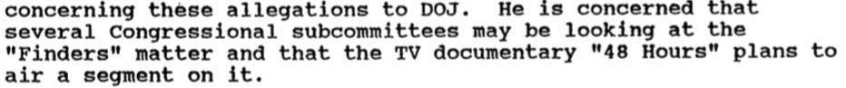 On page 40 we see clues as to how the Crime Syndicate’s star chamber sistema buries investigative evidence in the wrong agencies, making serious pursuit difficult. The U.S. Customs Service is the agency with briefing materials on The Finders. DOJ and FBI have to request copy of materials from USCS.
