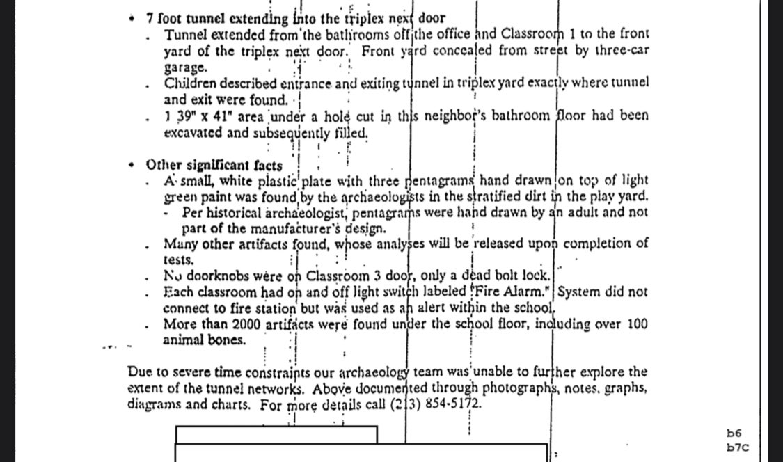 Page 48-49 states tunnels were found at McMartin Preschool, as well as pentagrams and bones. It’s all part of a descriptive report shown below. Then, at the bottom, comes the standard WTF hidden hand shutting the investigation down.