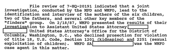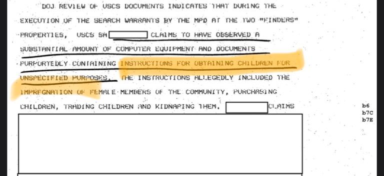 On page 41, the FBI report contains a link to a Washington Post article in which neighbors of one sketchy property said the residents were “a close-knit group of feminists who liked to help people and were not a cult.”The U.S. Attorney for D.C. declined to prosecute despite extensive evidence of abuse and satanic rituals. The case was complicated by the mothers being found, and possibly having given consent. US Attorney involved has an interesting career path to say the least.