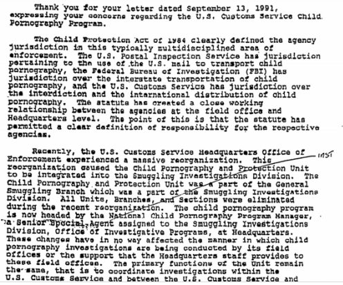 What’s worse, page 50 from 1991 shows a memo on jurisdiction. It describes how the U.S. Postal Service, the FBI and USCS carve up the turf on child crimes. USCS has jurisdiction over “interdiction and international distribution of child pornography”.