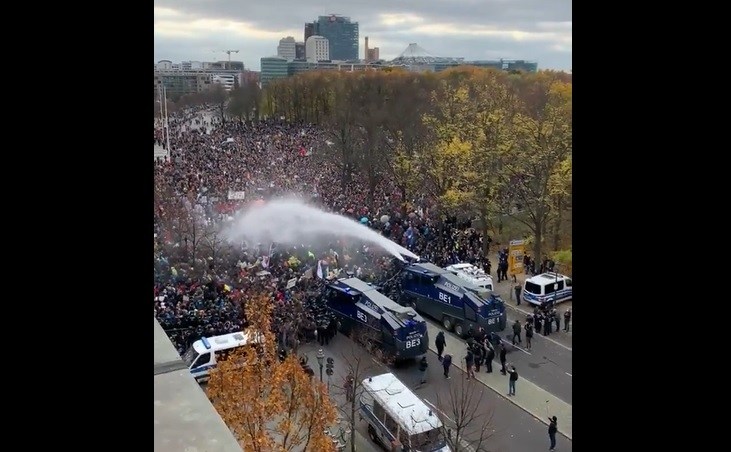 Water cannons shot at protesters in Berlin.