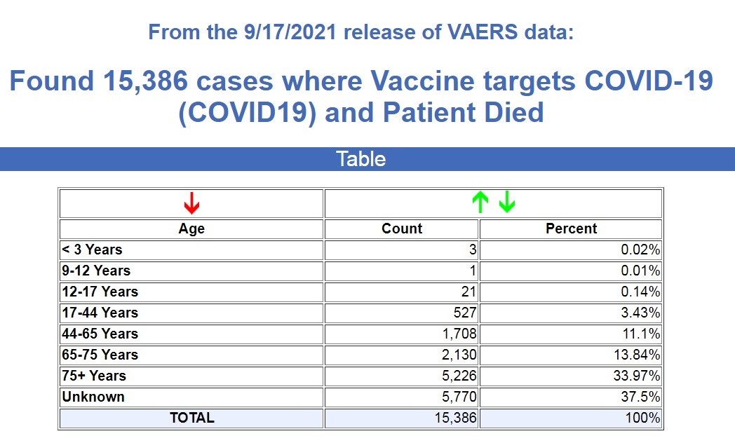 It is no surprise then that the vast majority of recorded deaths in VAERS following the COVID-19 injections is among people over the age of 65. Here is the breakdown by age according to statistics in the VAERS government database, which was just updated today (9/24/21).