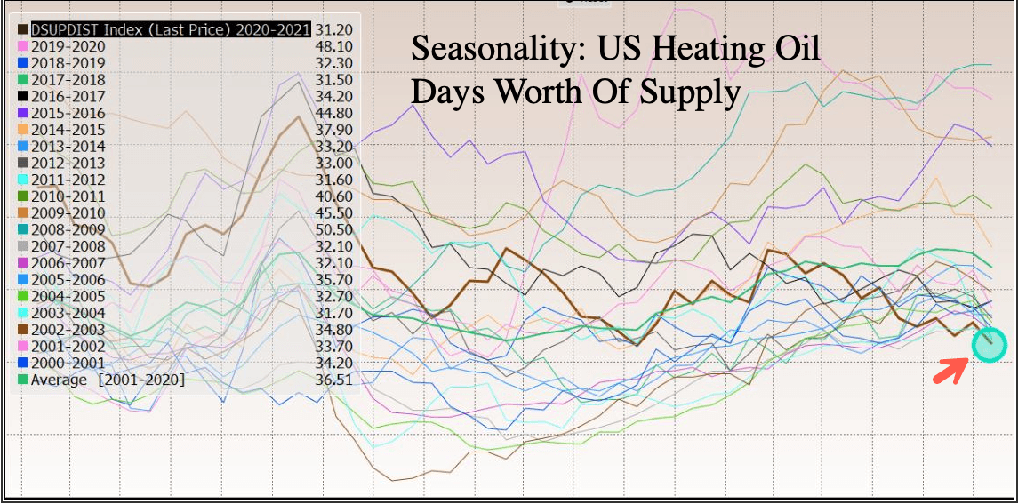 Energy Information Administration (EIA) reports there are only 31.2 days of the demand for heating oil, the lowest levels since 2000.