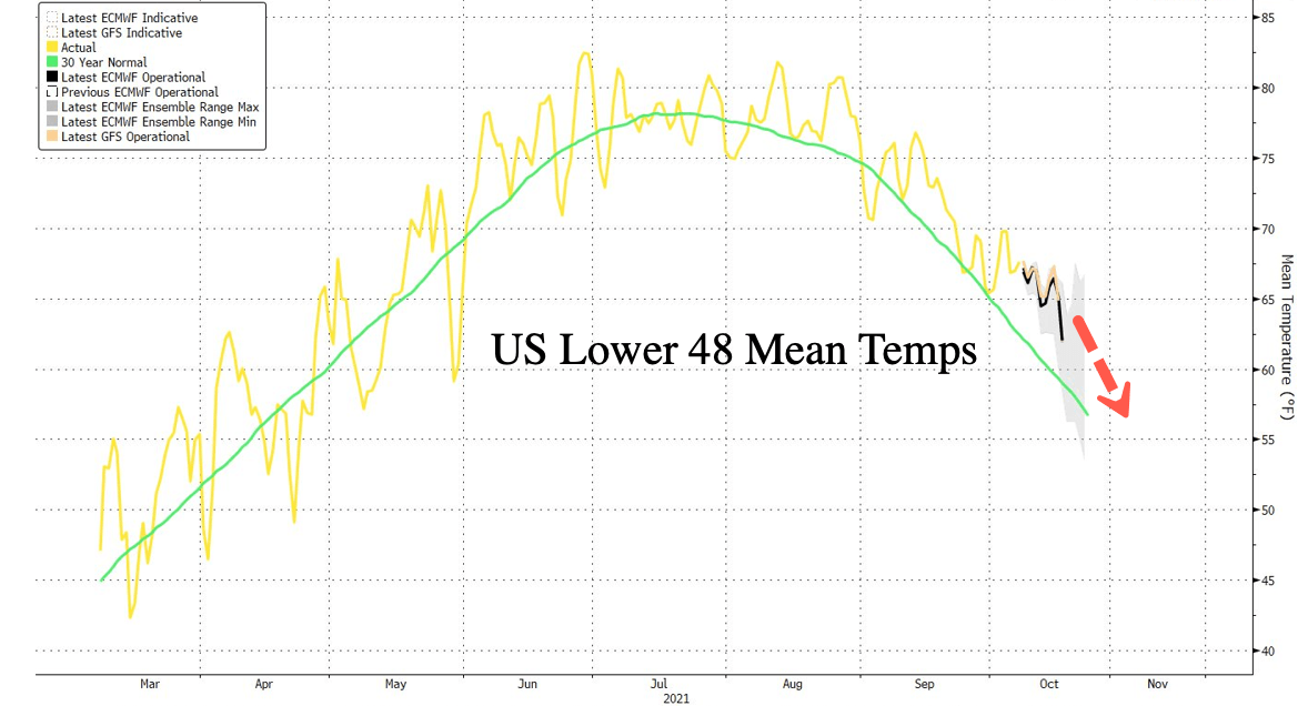 Low stockpiles ahead of cooler weather could be problematic for consumers who may be burdened with high energy costs, or worse, fuel shortages. Below is the two-week forecast for the US Lower 48, underlining cooler weather trends are nearing and how consumers shouldn’t wait until the last minute to fill up their tanks.