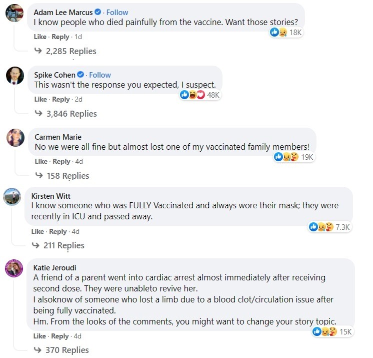 I don’t know if they got any such stories through direct messaging, but the post on their Facebook Page, as of the time of publication today, had received over 182,000 comments, and they seem to be all comments of those who have lost loved ones after receiving a COVID shot, and comments asking them why they are not covering that story.