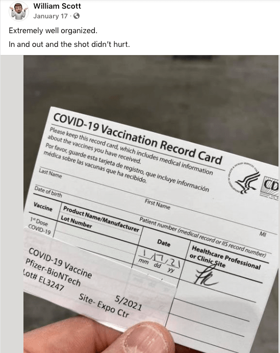 Mr. William “Bill” Scott announced on January 11 that he would receive the experimental Pfizer mRNA shot later that week at the Syracuse Exposition Center. He posted his COVID-19 Vaccination Record Card on January 17. A bizarre lot of comments follow the post. Mr. Scott received the second dose on February 7.
