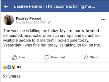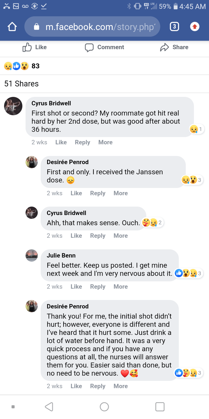 Ms. Desirée Penrod said on Facebook that she received the “Janssen dose” on or around March 9. Janssen Pharmaceuticals is the drug division of Johnson & Johnson, and developed the JNJ-78436735 viral vector shot.